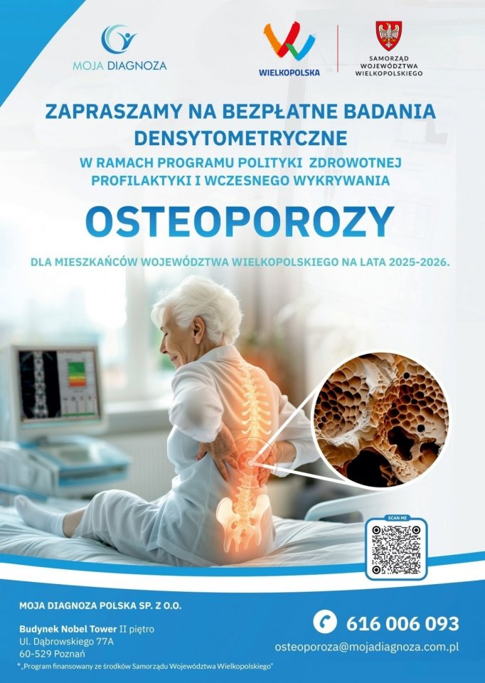 Osteoporoza często rozwija się bezobjawowo, a jej pierwszym sygnałem bywa dopiero złamanie. Wczesna diagnostyka to szansa na zahamowanie choroby i poprawę jakości życia. Program finansowany przez Samorząd Województwa Wielkopolskiego to doskonała okazja, aby zadbać o swoje zdrowie bez ponoszenia kosztów.